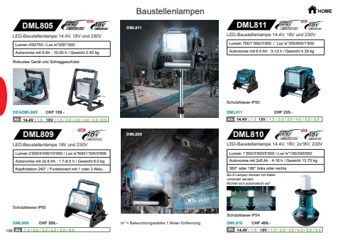 128DML809DML809DML811DML811DML805DEADML805DML809 DML810DML810Ah Ah 14.4V : 1.5 18V : 1.5 / 2.0 / 3.0 / 4.0 / 5.0 / 6.0 Ah Ah 14.4V : 1.5 18V : 1.5 / 2.0 / 3.0 / 4.0 / 5.0 / 6.0Ah Ah 1.5 / 2.0 / 3.0 / 4.0 / 5.0 / 6.0 Ah Ah 14.4V : 1.5 18V : 1.5 / 2.0 / 3.0 / 4.0 / 5.0 / 6.0DML811HOMELED-Baustellenlampe 18V und 230VLumen 2%u2019000/4%u2019000/10%u2019000 / Lux lx*800/1%u2019500/3%u2019800Autonomie mit 2x 6 Ah : 1.7-8.5 h / Gewicht 6.0 kgKopfrotation 240%u00b0 / Funktioniert mit 1 oder 2 AkkuLED-Baustellenlampe 14.4V, 18V und 230VLumen 750/1%u2019500/3%u2019000 / Lux lx*350/800/1%u2019800Autonomie mit 6.0 Ah : 3-13 h / Gewicht 4.39 kgBaustellenlampenLED-Baustellenlampe 14.4V, 18V und 230VLumen 450/750 / Lux lx*200*/300Autonomie mit 6 Ah : 10-20 h / Gewicht 2.40 kgRobustes Ger%u00e4t und Schlaggesch%u00fctztSchutzklasse IP65Schutzklasse IP65lx* = Beleuchtungsst%u00e4rke 1 Meter EntfernungLED-Baustellenlampe 14.4V, 18V, 2x18V, 230VLumen 1%u2019500/3%u2019000/5%u2019500 / Lux lx*150/300/550Autonomie mit 2x6 Ah : 4-18 h / Gewicht 13.70 kg360%u00b0 oder 180%u00b0 links oder rechts Bis 8 Lampen k%u00f6nnen mit Kabel verbindet werden.Richtet sich automatisch aufSchutzklasse IP54CHF 359.-CHF 159.- CHF 235.-CHF 409.-