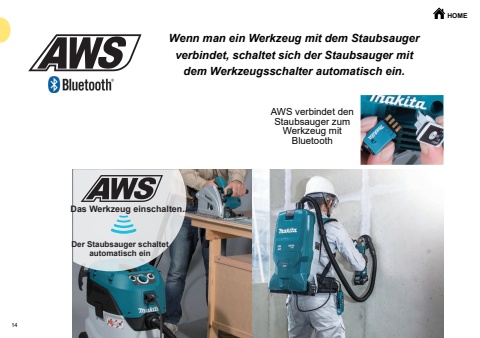 14HOMEAWS verbindet den Staubsauger zum Werkzeug mit BluetoothWenn man ein Werkzeug mit dem Staubsauger verbindet, schaltet sich der Staubsauger mit dem Werkzeugsschalter automatisch ein.Das Werkzeug einschalten..Der Staubsauger schaltetautomatisch ein