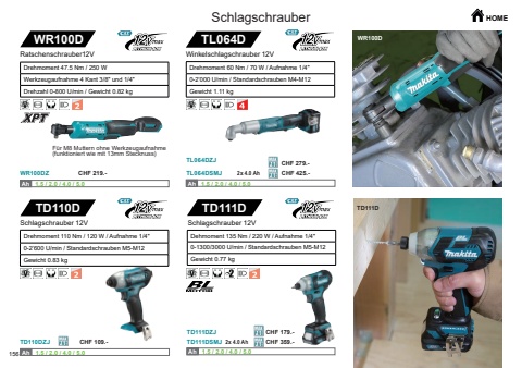 156TD110D TD111DTD110DZJ 2x 4.0 AhTD111DZJTD111DSMJTL064D2x 4.0 AhTL064DZJTL064DSMJAh Ah 1.5 / 2.0 / 4.0 / 5.0Ah Ah 1.5 / 2.0 / 4.0 / 5.0 Ah Ah 1.5 / 2.0 / 4.0 / 5.0WR100DWR100DZAh Ah 1.5 / 2.0 / 4.0 / 5.0WR100DTD111DHOMESchlagschrauber 12VDrehmoment 110 Nm / 120 W / Aufnahme 1/4\0-2%u2019600 U/min / Standardschrauben M5-M12Gewicht 0.83 kgSchlagschrauber 12VDehmoment 135 Nm / 220 W / Aufnahme 1/4\0-1300/3000 U/min / Standardschrauben M5-M12Gewicht 0.77 kgSchlagschrauberDrehmoment 60 Nm / 70 W / Aufnahme 1/4\0-2%u2019000 U/min / Standardschrauben M4-M12Gewicht 1.11 kgWinkelschlagschrauber 12VDrehmoment 47.5 Nm / 250 WWerkzeugaufnahme 4 Kant 3/8\Drehzahl 0-800 U/min / Gewicht 0.82 kgRatschenschrauber12VF%u00fcr M8 Muttern ohne Werkzeugaufnahme (funktioniert wie mit 13mm Stecknuss)CHF 109.- CHF 359.-CHF 179.-CHF 425.-CHF 279.-CHF 219.-