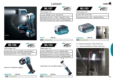 163ML103DEAML103DEAML104ML106 ML104DEAML106ML107ML107ML106ML104Ah Ah 1.5 / 2.0 / 4.0 Ah Ah 1.5 / 2.0 / 4.0 Ah Ah 1.5 / 2.0 / 4.0 Ah Ah 1.5 / 2.0 / 4.0 HOMELumen 100 / Lux lx* 240Autonomie mit 4 Ah : 28 h / Gewicht 0.06 kgLED-Lampe 12VLampenLED-Lampe 12V StabLampe 12VLumen 130/190/710 / Lux lx** 190/340/1%u2019900Autonomie mit 4 Ah : 5.5-19 h / Gewicht 0.40 kgMit USB-Anschluss zum Laden von Elektroger%u00e4ten3 Modi (360%u00b0, 90%u00b0 und Stab-Funktion) Lumen 190 / Lux lx* 170-4%u2019500 / Zoom-FunktionAutonomie mit 4 Ah : 12 h / Gewicht 0.40 kgKopf auf 12 Positionen regelbarLumen 100/200 / Lux lx* 130/130/175 Autonomie mit 4 Ah : 17-29 h / Gewicht 0.14 kgMit USB-Anschluss zum Laden von Elektroger%u00e4tenLED-Lampe 12Vlx* = Beleuchtungsst%u00e4rke 1 Meter Entfernung lx** = Beleuchtungsst%u00e4rke 0.5 Meter EntfernungCHF 35.-CHF 59.- CHF 95.-CHF 49.-