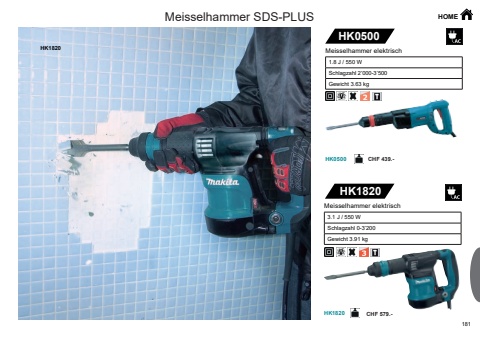 181HK0500HK1820HK1820HK0500HK1820CHF 439.-CHF 579.-HOMEMeisselhammer elektrisch1.8 J / 550 W Schlagzahl 2%u2019000-3%u2019500 Gewicht 3.63 kg3.1 J / 550 W Schlagzahl 0-3%u2019200 Gewicht 3.91 kgMeisselhammer elektrischMeisselhammer SDS-PLUS