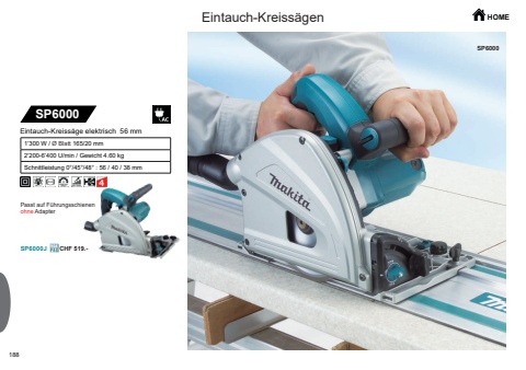 188SP6000SP6000JSP6000CHF 519.-Eintauch-Kreiss%u00e4gen HOMEEintauch-Kreiss%u00e4ge elektrisch 56 mm1%u2019300 W / %u00d8 Blatt 165/20 mm2%u2019200-6%u2019400 U/min / Gewicht 4.60 kgSchnittleistung 0%u00b0/45%u00b0/48%u00b0 : 56 / 40 / 38 mmPasst auf F%u00fchrungsschienenohne Adapter