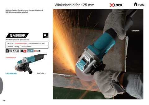206GA5080RGA5080RX02GA5080RCHF 229.-Winkelschleifer 125 mm HOMESuperflanschWinkelschleifer elektrisch1%u2019400 W / Schiebeschalter / Scheiben %u00d8 125 mmGewicht 2.87 kg / 12%u2019000 U/minMit Anti-Restart Funktion und KonstantelektronikMit Schruppscheibe geliefert