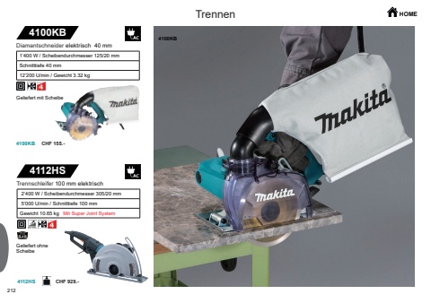 2124100KB4112HS4112HS4100KB4100KBCHF 155.-CHF 929.-Trennen HOMEDiamantschneider elektrisch 40 mm1%u2019400 W / Scheibendurchmesser 125/20 mmSchnitttiefe 40 mm 12%u2019200 U/min / Gewicht 3.32 kg Trennschleifer 100 mm elektrisch 2%u2019400 W / Scheibendurchmesser 305/20 mm 5%u2019000 U/min / Schnitttiefe 100 mmGewicht 10.65 kg Mit Super Joint SystemGeliefert ohne ScheibeGeliefert mit Scheibe