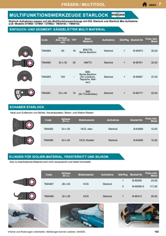 467H%u00c4MMERINDEXIrrt%u00fcmer und %u00c4nderungen vorbehalten. Abbildungen k%u00f6nnen variieren. 04/2025MEISSELTypBeschreibungBreite x L%u00e4nge(mm)Bestell-Nr.Preis inkl. MwstSpitzmeisselF%u00fcr allgemeine Meissel- und Aufbrucharbeiten von Mauerwerk, Beton und losem Gestein250P-2506814,00Spitzmeisselselbstsch%u00e4rfend250B-64761*17,00Flachmeissel20 x 200P-2507415,00Flachmeisselselbstsch%u00e4rfend20 x 250B-64777*18,00BreitmeisselF%u00fcr universelles Abtragen von Materialien gr%u00f6sseren Umfangs37 x 200A-3048322,00Breitmeissel selbstsch%u00e4rfend40 x 250B-14059*26,00Breitmeisselselbstsch%u00e4rfend60 x 250B-14065*32,00Breitmeissel80 x 150D-6104222,00Breitmeissel80 x 250D-6102030,00HohlmeisselZum Stemmen von schmalen Kan%u00e4len in Mauerwerk22 x 240P-2508030,00FliesenmeisselGekr%u00f6pfter und flacher Meissel.Zum Abschlagen von Fliesen geeignet.Die flache Schneide minimiert das Brechen von Fliesen40 x 260P-6398726,00Fliesenmeissel selbstsch%u00e4rfend40 x 260B-14071**30,00Schaber komplett100 x 160A-68161146,00ErsatzSchaberblech343411-946,00* 30% h%u00f6here Abtragsleistung, aufgrund der selbstsch%u00e4rfenden Eigenschaft in Verbindung mit der neuartigen Form (kein extra Nachsch%u00e4rfen notwendig). Deutlich l%u00e4ngere Lebensdauer.** 40% h%u00f6here Abtragsleistung. Geeignet f%u00fcr schmale Fugen zwischen Fliesen, dank flachem Spaten.Weniger Fliesenbruch aufgrund seiner speziellen Form.SDS-PLUS