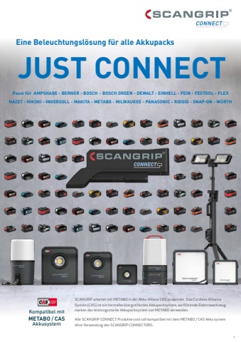 JUST CONNECTEine Beleuchtungsl%u00f6sung f%u00fcr alle AkkupacksPasst f%u00fcrAMPSHARE - BERNER - BOSCH - BOSCH GREEN - DEWALT - EINHELL - FEIN - FESTOOL - FLEXHAZET - HIKOKI - INGERSOLL - MAKITA - METABO - MILWAUKEE - PANASONIC - RIDGID - SNAP ON - W%u00dcRTHSCANGRIP arbeitet mit METABO in der Akku-Allianz CAS zusammen. Das Cordless Alliance System (CAS) ist ein hersteller%u00fcbergreifendes Akkupacksystem, wo f%u00fchrende Elektrowerkzeugmarken das leistungsstarke Akkupacksystem von METABO verwenden. Alle SCANGRIP CONNECT Produkte sind voll kompatibel mit dem METABO / CAS Akkusystem ohne Verwendung des SCANGRIP CONNECTORS.Kompatibel mitMETABO / CASAkkusystem7