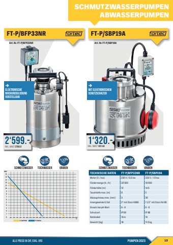 ALLE PREISE IN CHF, EXKL. VRG PUMPEN 2023 13Art. Nr. FT-P/SBP19AFT-P/SBP19ATECHNISCHE DATEN FT-P/BFP33NR FT-P/SBP19AMotor (V / kw) 230 V / 0.5 kw 230 V / 1.5 kwF%u00f6rdermenge (lt. /h) 33'000 19%u2018200 F%u00f6rderh%u00f6he (m) 12 14.5 Tauchtiefe max. (m) 8 5 Absaugniveau max. (mm) 3 30Innengewinde G Zoll 2%u201c mit Storz KA66 1 1/2%u201c mit Storz KA 66Einsatz bei pH-Wert 6 - 9 6 - 9Schutzart IP 68 IP 68Netzkabel 10 m 10Gewicht (kg) 18 11.5 kg%u2192Mit elektronischem SchutzschalterArt. Nr. FT-P/BFP33NRFT-P/BFP33NR%u2192ElektronischeNiveauregulierungverstellbarSchmutzwasser Teichwasser GRUBEN Schmutzwasser Teichwasser GRUBENSCHMUTZWASSERPUMPENABWASSERPUMPEN1%u2018320.-INKL. MWST 1421.642%u2018599.-INKL. MWST 2799.12