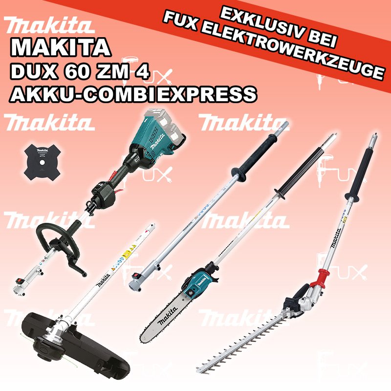 Zu "Akku CombiExpress" von Makita FUX SPECIAL EXKLUSIV BEI FUX Makita DUX 60 ZM 4 Akku-CombiExpress Bestell- und Artikelnummer: DUX60ZM4 SET 11 DUX 60 ZM 4 Akku-CombiExpress mit GrasschneidekopfAkkuspannung 2 x 18 V Leerlaufdrehzahl 0 - 9700 min-1 Masse (LxBxH) 1011x320x216 mm Gewicht (EPTA) 4.1 kgInfos EN 402 MP Heckenscheren-Aufsatz 500 mmMax. Schnittbreite 50 cm Hubzahl 2400 / 2800 / 3400 / 4000 min⁻¹ Abmessung (L x B x H) 1444 x 144 x 85 mm Gewicht 2.4 kgInfos LE 400 MP Verlängerung Verlängerung für Heckenscheren und Säge Länge: 1 m Gewicht: 1.1 kgInfos EY403MP Hochentaster-AufsatzArbeitslänge 300 mm Teilung 3/8" Nutbreite 1.1 mm Nettogewicht 2.0 kgInfos 4 Zahn Dickichtmesser aus MetallDurchmesser Ø 230 mm Bohrung Ø 25.4 mm Dicke 1.8 mmInfos OHNE AKKUS UND LADEGERÄT Standard-Ausrüstung In diesem Set enthalten: DUX 60 ZM 4 Akku-CombiExpress mit Grasschneidekopf EN 402 MP Heckenscheren-Aufsatz 500 mm LE 400 MP Verlängerung EY403MP Hochentaster-Aufsatz 4 Zahn Dickichtmesser aus Metall Zubehör Listenpreis CHF 1'242.00 Fuxpreis CHF 824.00 inkl. 8.1% MwSt, inkl vRG Versand CHF 30.00 Kein Grauimport! Produkt bestellen 1 Stück 2 Stück 3 Stück 4 Stück 5 Stück 6 Stück 7 Stück 8 Stück 9 Stück 10 Stück Alle Angaben ohne Gewähr und solange Vorrat reicht!Wiederverkäufer werden? Produkt als PDF AKTION 33%