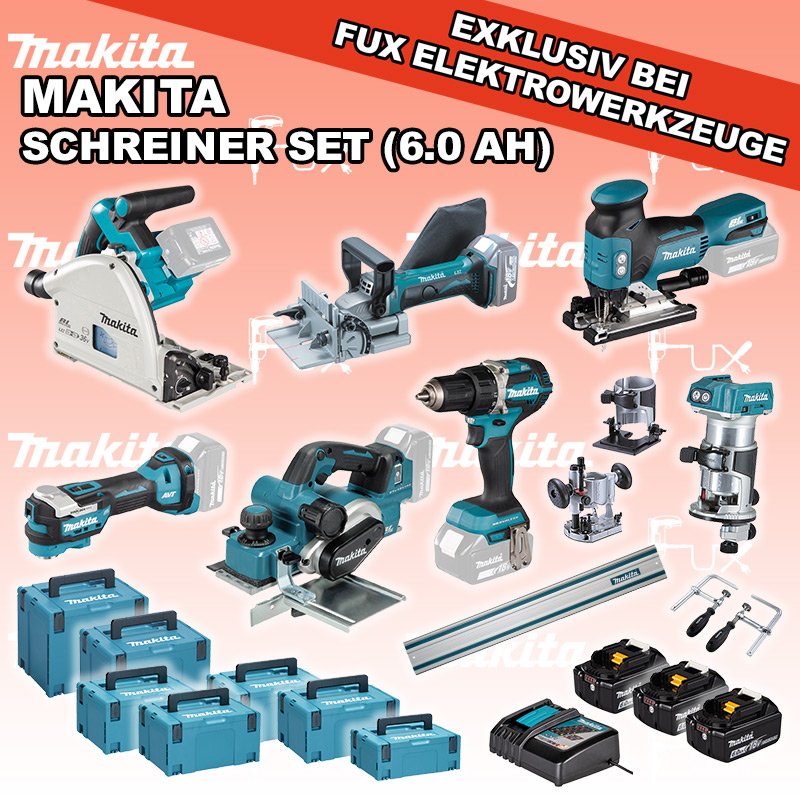 Heute auf dieses Produkt 31% Rabatt! Zu "Akku Maschinen SET 18 Volt" von Makita Black Fuxday Aktionen FUX SPECIAL EXKLUSIV BEI FUX Makita 7-teiliges Schreiner Set 7 (6.0 Ah) Bestell- und Artikelnummer: Schreiner Set 7 DSP601ZJU Eintauch-KreissägeAkkuspannung 2 x 18 V Sägeblatt (Ø) 165 mm Schnitttiefe bei 90° 56 mm Gewicht (EPTA) 5.1 kg Infos DTM52Z Multifunktions WerkzeugAkkuspannung 18 V Schwingungen 10000 - 20000 min-1 Werkzeugaufnahme Starlock Max System Gewicht inkl. Akku 2.0 kg Infos DJV18ZJ Akku-StichsägeAkkuspannung 18 V Hubzahl 800 - 3500/ min Schnittleistung Holz 135 mm / Stahl 10 mm Gewicht 2.5 kgInfos DRT50ZJX11 Akku-Einhandfräse / Kantenfräse Akkuspannung 18 V Leerlaufdrehzahl 10000 - 30000 min-1 Tiefeneinstellung bis 40 mm Gewicht 2.0 kgInfos DDF484ZJ Akku-BohrschrauberAkkuspannung 18 V Drehzahlen 0-500 / 0-2000 U/min Drehmoment hart / weich 54 / 30 Nm Gewicht 1.5 kgInfos DKP181ZJ Akku-Einhand-HobelAkkuspannung 18 V Hobelbreite 82 mm Spanabnahme stufenlos 0 - 3 mm Gewicht inkl. Akku 3.6 kgInfos DPJ180ZJ Akku-Universal-NutfräseAkkuspannung 18 V Leerlaufdrehzahl 6500 min-1 Fräserdurchmesser 100 mm Gewicht inkl. Akku 3.3 kgInfos 3 x BL 1860 B ( Li-Ion Akku )18 V 6.0 Ah ( Li-Ion Akku ) Infos DC 18 RC Schnell-Ladegerätfür Akkus 14.4 - 18 Volt ( Li-Ion Akkus )Infos Führungsschiene L = 140 cmgeeignet für SP6000 Handkreissäge mit passenden Adapter Auch für weitere Handkreissägen und Stichsägen geeignet mit passendem Adapter. ( 194579-2 )Infos 194385-5 Schraubzwingen für Führungsschienen2 Schraubzwingen für FührungsschienenInfos MAKPAC Gr. 3Produktabmessung (L x B x H) 377 x 277 x 176 mm Infos Einsatz für DTM52 Einsatz für DTM52 Makpac Koffer Typ C (821551-8) Infos Standard-Ausrüstung In diesem Set enthalten: DSP601ZJU Eintauch-Kreissäge DTM52Z Multifunktions Werkzeug DJV18ZJ Akku-Stichsäge DRT50ZJX11 Akku-Einhandfräse / Kantenfräse DDF484ZJ Akku-Bohrschrauber DKP181ZJ Akku-Einhand-Hobel DPJ180ZJ Akku-Universal-Nutfräse 3 x BL 1860 B ( Li-Ion Akku ) DC 18 RC Schnell-Ladegerät Führungsschiene L = 140 cm 194385-5 Schraubzwingen für Führungsschienen MAKPAC Gr. 3 Einsatz für DTM52 Zubehör Listenpreis CHF 3'343.00 Fuxpreis CHF 2'293.00 inkl. 8.1% MwSt, inkl vRG Frankolieferung Kein Grauimport! Produkt bestellen 1 Stück 2 Stück 3 Stück 4 Stück 5 Stück 6 Stück 7 Stück 8 Stück 9 Stück 10 Stück Option: Makita BL 1860 B ( Li-lon Akku ) für CHF 95.- statt CHF 124.-Infos Alle Angaben ohne Gewähr und solange Vorrat reicht!Wiederverkäufer werden? Produkt als PDF NEUHEITAKTION 31%