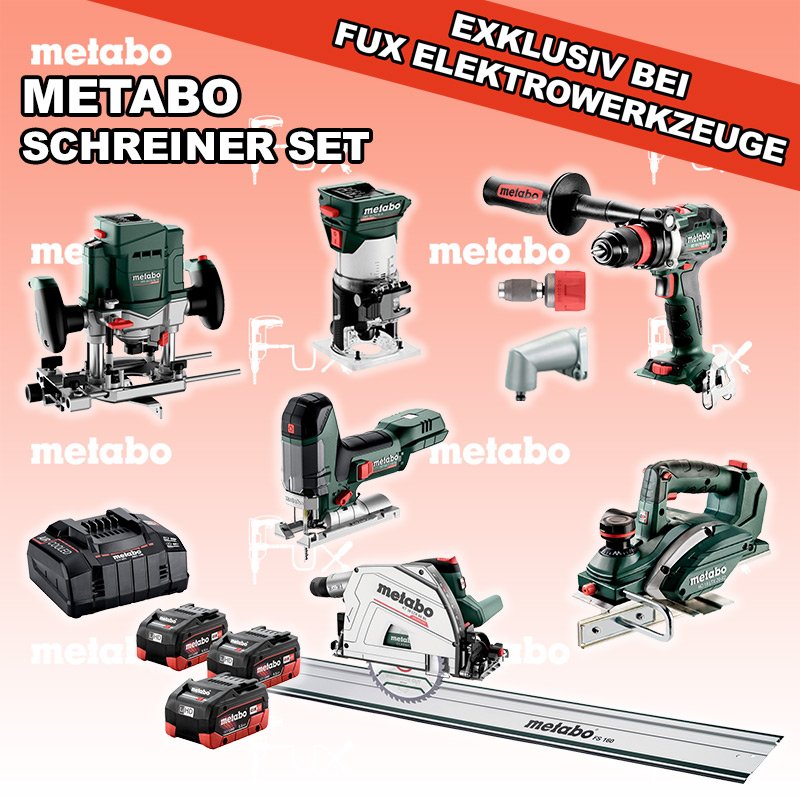 Heute auf dieses Produkt 39% Rabatt! Zu "Combo Set 18 Volt " von Metabo FULL Service: 36 Monate zum Nulltarif für Sie! Weitere Infos zum FULL Service Dieses Produkt ist CAS kompatibel! Weitere Infos zu CAS Black Fuxday Aktionen FUX SPECIAL EXKLUSIV BEI FUX Metabo Schreiner Set 3 LiHD Bestell- und Artikelnummer: Schreiner Set 3 LiHD ST 18 LT 130 BL Akku-StichsägeAkkuspannung 18 V Hubzahl 1000-3.500 /min Gewicht ohne Akkupack 1.5 kgInfos BS 18 LTX BL Q I Akku-BohrschrauberAkkuspannung 18 V Drehzahl 0-550 / 0-2000 U/min Drehmoment hart / weich 130 / 65 Nm Gewicht (mit Akkupack) 2.3 kgInfos FMV 18 LTX BL 8 Akku Kantenfräse Akkuspannung 18 V Leerlaufdrehzahl 4.800 - 29.000 /min Spannbohrung der Spannzange 6 / 8 mmInfos OFV 18 LTX BL 12 Akku-OberfräseAkkuspannung 18 V Leerlaufdrehzahl 11.000 - 25.000 / min Spannbohrung der Spannzange 6 / 8 / 12 mm Gewicht ohne Akkupack 2.900 gInfos KT 18 LTX 66 BL Akku TauchkreissägeAkkuspannung 18 V Schnitt-Tiefe bei 90° 0-66 mm Sägeblatt 165 mm Gewicht 5.3 kgInfos HO 18 LTX 20-82 Akku-Einhand-HobelAkkuspannung 18 V Hobelbreite 82 mm Spanabnahme einstellbar 0-2 mm Gewicht 3.5 KgInfos FS 160 FührungsschieneGesamtlänge 1600 mmInfos 3 x 18 V, 5.5 Ah, LiHD Akkupack18 V 5.5 Ah ( LiHD Akkus ) Infos ASC 145, 12 - 36 V "Air Cooled" LadegerätZum Aufladen aller Li-Power Schiebesitz-Akkupacks (12 V - 36 V). Ladestrom 8.0 AInfos Schnellwechselbithalter »Quick«Schnellwechselbithalter »Quick« Geeignet für alle Metabo "Quick" Maschinen Bits mit 1/4 "Außensechskantantrieb Infos Schnellwechselwinkeladapter »Quick«Metabo "Quick" Maschinen mit Spannzange Ø 43 mm Magnetischer Bithalter mit 1/4 "(6,35 mm) SechskantschaftInfos Standard-Ausrüstung In diesem Set enthalten: ST 18 LT 130 BL Akku-Stichsäge BS 18 LTX BL Q I Akku-Bohrschrauber FMV 18 LTX BL 8 Akku Kantenfräse OFV 18 LTX BL 12 Akku-Oberfräse KT 18 LTX 66 BL Akku Tauchkreissäge HO 18 LTX 20-82 Akku-Einhand-Hobel FS 160 Führungsschiene 3 x 18 V, 5.5 Ah, LiHD Akkupack ASC 145, 12 - 36 V "Air Cooled" Ladegerät Schnellwechselbithalter »Quick« Schnellwechselwinkeladapter »Quick« Zubehör Verbrauchsmaterial Listenpreis CHF 2'990.50 Fuxpreis CHF 1'801.00 inkl. 8.1% MwSt, inkl vRG Versand CHF 40.00 Kein Grauimport! Produkt bestellen 1 Stück 2 Stück 3 Stück 4 Stück 5 Stück 6 Stück 7 Stück 8 Stück 9 Stück 10 Stück Alle Angaben ohne Gewähr und solange Vorrat reicht!Wiederverkäufer werden? Produkt als PDFVideo LiHD 1Video LiHD 2 AKTION 39%