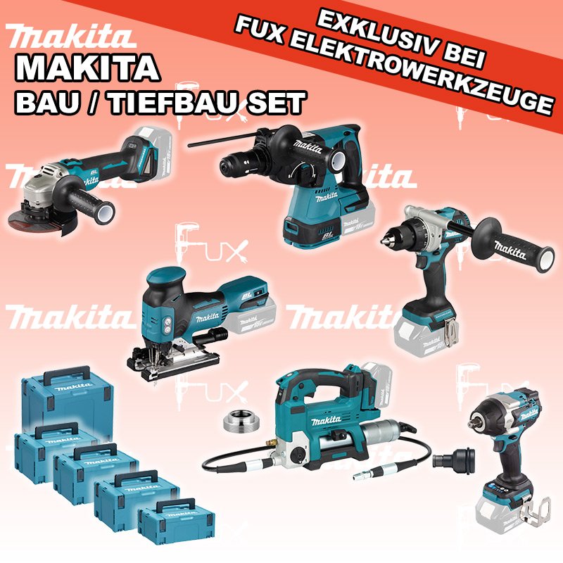 Zu "Bau / Tiefbau Set" von Makita FUX SPECIAL EXKLUSIV BEI FUX Makita Bau / Tiefbau Set 4 SOLO Bestell- und Artikelnummer: maBau / Tiefbau Set 4 SOLO DDF492Z Akku-BohrschrauberAkkuspannung 18 V Leerlaufdrehzahl 0 - 550 / 0 - 2100 min⁻¹ Drehmoment hart / weich 130 / 65 Nm Gewicht inkl. Akku 2.3 - 2.6 kgInfos DJV18ZJ Akku-StichsägeAkkuspannung 18 V Hubzahl 800 - 3500/ min Schnittleistung Holz 135 mm / Stahl 10 mm Gewicht 2.5 kgInfos DHR243ZJ Akku-BohrhammerAkkuspannung 18 V Einzelschlagstärke 2.0 J ( EPTA ) Bohrleistung in Beton 24 mm Gewicht 3.4 kgInfos DGA506ZJ Akku-WinkelschleiferAkkuspannung 18 V Drehzahl 9000 U / min Scheibendurchmesser 125 mm Gewicht 2,5 kgInfos DTW700Z Akku-SchlagschrauberAkkuspannung 18 V Anziehdrehmoment 700 Nm Werkzeugaufnahme 1/2" Gewicht inkl. Akku 2.7 kgInfos DGP180Z Akku-FettpresseAkkuspannung 18 V Maximaler Druck 690 bar Auspressgeschwindigkeit 145 / 290 ml/min Gewicht inkl. Akku 6.1 kgInfos Reduktions Adapter 1/2" auf 1/4" Aufnahme Max. 350 Nm Länge 45 mmInfos Adapter für Lube-Shuttle® 400GAdapter zum Umrüsten von Fettbehälter auf Lube-Shuttle®* Kartusche 400g geeignet für FP 18 LTXInfos MAKPAC Gr. 2Produktabmessung (L x B x H) 395 x 295 x 163 mm Infos MAKPAC Gr. 3Produktabmessung (L x B x H) 377 x 277 x 176 mm Infos Einsatz für diverse Akkuschrauber Einsatz für DDF343ZJ, DDF441, DDF446, DDF448, DDF451, DDF453, DDF456R, DDF458, DDF459, DDF480, DDF481, DDF482, DDF484, DDF485, DDF486, DHP441, DHP446, DHP448, DHP451, DHP456, DHP458, DHP459, DHP470, DHP480, DHP481, DHP482, DHP484, DHP485, DHP486, DLX2126TJ1, DLX3092TJInfos Einsatz für DTW1001 / DTW1002 / DTW450Einsatz für DTW1001 / DTW1002 / DTW450 Makpac Koffer Typ C (821551-8) Infos OHNE AKKUS UND LADEGERÄT Standard-Ausrüstung In diesem Set enthalten: DDF492Z Akku-Bohrschrauber DJV18ZJ Akku-Stichsäge DHR243ZJ Akku-Bohrhammer DGA506ZJ Akku-Winkelschleifer DTW700Z Akku-Schlagschrauber DGP180Z Akku-Fettpresse Reduktions Adapter Adapter für Lube-Shuttle® 400G MAKPAC Gr. 2 MAKPAC Gr. 3 Einsatz für diverse Akkuschrauber Einsatz für DTW1001 / DTW1002 / DTW450 Geliefert im KofferDGP180Z Akku-Fettpresse ohne Koffer Zubehör Listenpreis CHF 2'210.00 Fuxpreis CHF 1'503.00 inklusive 8.1% MwSt Versand CHF 20.00 Kein Grauimport! Produkt bestellen 1 Stück 2 Stück 3 Stück 4 Stück 5 Stück 6 Stück 7 Stück 8 Stück 9 Stück 10 Stück Option: Makita BL 1860 B ( Li-lon Akku ) für CHF 95.- statt CHF 124.-Infos Alle Angaben ohne Gewähr und solange Vorrat reicht!Wiederverkäufer werden? Produkt als PDF NEUHEITAKTION 32%