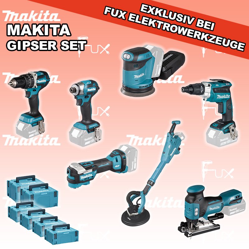 Makita Gipser Set 13 SOLO DHP484ZJ Akku-Schlagbohrschrauber DFS251ZJ Akku-Schrauber DSL801ZU Akku-Langhalsschleifer DBO180ZJ Akku-Exzenterschleifer DTM52Z Multifunktions Werkzeug DJV18ZJ Akku-Stichsäge DTD173Z Akku-Schlagschrauber MAKPAC Gr. 3 Einsatz für DTM52 MAKPAC Gr. 2 Einsatz für diverse Schlagschrauber