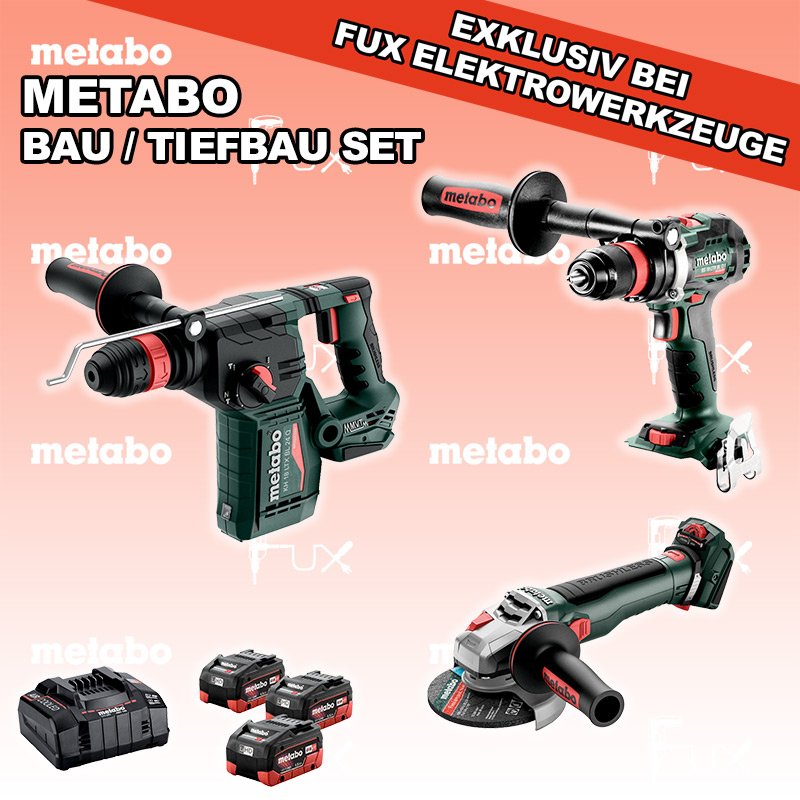 Das Ladenlokal bleibt vom 25. Dezember 2025 bis am 04. Januar 2026 geschlossen. Bestellungen und Lieferungen von Neugeräten werden trotz Ferienabwesenheit in gewohnter Fux-Manier entgegengenommen und ausgeliefert. Zu "Bau / Tiefbau Set" von Metabo FULL Service: 36 Monate zum Nulltarif für Sie! Weitere Infos zum FULL Service FUX SPECIAL EXKLUSIV BEI FUX Metabo Bau / Tiefbau Set 5 Bestell- und Artikelnummer: Bau / Tiefbau Set 5 BS 18 LTX BL Q I Akku-BohrschrauberAkkuspannung 18 V Drehzahl 0-550 / 0-2000 U/min Drehmoment hart / weich 130 / 65 Nm Gewicht (mit Akkupack) 2.3 kgInfos KH 18 LTX BL 24 Q Akku-KombihammerAkkuspannung 18 V Einzelschlagstärke 2.2 J Bohrleistung in Beton 24 mm Gewicht ohne Akkupack 3 kgInfos WVB 18 LT BL 11-125 Quick Akku-WinkelschleiferAkkuspannung 18 V Drehzahl 2.800 - 10.000 / min Ø 125 mm Scheiben Gewicht (mit Akkupack) 2.5 kgInfos 3 x 18 V, 5.5 Ah, LiHD Akkupack18 V 5.5 Ah ( LiHD Akkus ) Infos ASC 145, 12 - 36 V "Air Cooled" LadegerätZum Aufladen aller Li-Power Schiebesitz-Akkupacks (12 V - 36 V). Ladestrom 8.0 AInfos Registriere die in diesem Set vorhandenen Metabo Maschinen auf metabo.ch, und ergattere dir bis zu 5 Gratis Akkus!Zusätzlich offerieren wir zu diesem Set einen Gratis Akku! Standard-Ausrüstung In diesem Set enthalten: BS 18 LTX BL Q I Akku-Bohrschrauber KH 18 LTX BL 24 Q Akku-Kombihammer WVB 18 LT BL 11-125 Quick Akku-Winkelschleifer 3 x 18 V, 5.5 Ah, LiHD Akkupack ASC 145, 12 - 36 V "Air Cooled" Ladegerät Listenpreis CHF 1'509.00 Fuxpreis CHF 1'031.00 inkl. 8.1% MwSt, inkl vRG Frankolieferung Kein Grauimport! Produkt bestellen 1 Stück 2 Stück 3 Stück 4 Stück 5 Stück 6 Stück 7 Stück 8 Stück 9 Stück 10 Stück Alle Angaben ohne Gewähr und solange Vorrat reicht!Wiederverkäufer werden? Produkt als PDF NEUHEITAKTION 31%