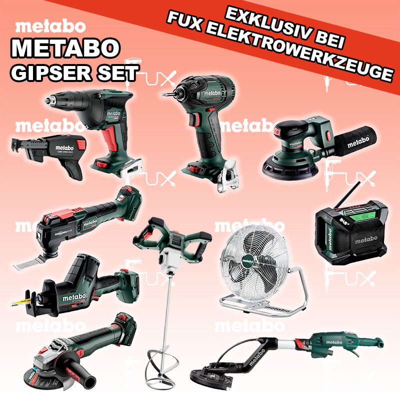 Metabo Gipser Set  8 SOLO BS 18 L BL Q Akku-Bohrschrauber TBS 18 LTX BL 5000 Akku-Trockenbauschrauber RW 18 LTX BL 140-2 Akku-Rührwerk SSD 18 LTX 200 BL Akku-Schlagschrauber WVB 18 LT BL 11-125 Quick Akku-Winkelschleifer R 12-18 DAB+ BT Akku-Baustellenradio SSE 18 LTX BL Compact Akku-Säbelsäge MT 18 LTX BL QSL Akku-Multitool AV 18 Akku-Ventilator LSV 5-225 Comfort Langhalsschleifer Schrauber-Magazin Speed Fix 57