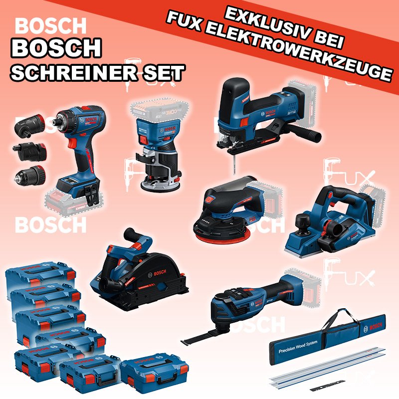 Das Ladenlokal bleibt vom 23. Februar 2026 bis am 28. Februar 2026 geschlossen. Bestellungen und Lieferungen von Neugeräten werden trotz Ferienabwesenheit in gewohnter Fux-Manier entgegengenommen und ausgeliefert. Zu "Schreiner Set" von Bosch Professional FUX SPECIAL EXKLUSIV BEI FUX Bosch Expert EXSchreiner Set 11 SOLO Bestell- und Artikelnummer: Bosch Schreiner Set 11 SOLO 5 Jahre Garantie auf Bosch Expert Maschinen EXST18V-155S Akku-StichsägeAkkuspannung 18 V Hubzahl bei Leerlauf 800 - 3800 min⁻¹ Hubhöhe 26 mm Gewicht exkl. Akku 1.9 kgInfos EXSR18V-90FC Akku-BohrschrauberAkkuspannung 18 V Drehmoment 36 / 65 / - Nm Leerlaufdrehzahl 0 – 630 / 0 – 2100 min⁻¹ Gewicht exkl. Akku 0.92 kgInfos GKF 18V-8 Akku-KantenfräseAkkuspannung 18 V Leerlaufdrehzahl 10000 – 30000 min⁻¹ 6 mm, 8 mm, 1/4'' Gewicht exkl. Akku 1.1 kg Infos EXKT18V-52G Akku-TauchsägeAkkuspannung 18 V Leerlaufdrehzahl 2800 – 5500 min⁻¹ Gewicht exkl. Akku 4.1 kgInfos GHO 18V-26 Akku-EinhandhobelAkkuspannung 18 V Spanabnahme einstellbar 0 - 2.6 mm Infos EXOP18V-40 Akku-Multi-CutterAkkuspannung 18 V Leerlaufschwingzahl 10000 – 20000 min⁻¹ Oszillationswinkel links und rechts 2 ° Gewicht exkl. Akku 1.24 kgInfos EXEX18V-150-5 Akku-ExzenterschleiferAkkuspannung 18 V Schleifteller-Ø 150 mm Leerlaufdrehzahl 5000 – 10000 Umin Schwingzahl 10000 – 20000 min⁻¹ Gewicht exkl. Akku 1.2 kgInfos FSN 1400 Set Führungsschienensysteme Systemzubehör2 x Führungsschiene FSN 1400 Verbindungsstück FSN VEL Tasche FSN BAGInfos OHNE AKKUS UND LADEGERÄT Standard-Ausrüstung In diesem Set enthalten: EXST18V-155S Akku-Stichsäge EXSR18V-90FC Akku-Bohrschrauber GKF 18V-8 Akku-Kantenfräse EXKT18V-52G Akku-Tauchsäge GHO 18V-26 Akku-Einhandhobel EXOP18V-40 Akku-Multi-Cutter EXEX18V-150-5 Akku-Exzenterschleifer FSN 1400 Set Führungsschienensysteme Systemzubehör Geliefert im Koffer Zubehör Listenpreis CHF 3'203.60 Fuxpreis CHF 2'510.00 inklusive 8.1% MwSt Kostenloser Versand Kein Grauimport! Produkt bestellen Das Produkt ist momentan nicht lieferbar!Bestätigen sie, dass sie damit einverstanden sind! 1 Stück 2 Stück 3 Stück 4 Stück 5 Stück 6 Stück 7 Stück 8 Stück 9 Stück 10 Stück Alle Angaben ohne Gewähr und solange Vorrat reicht! Produkt als PDF NEUHEITAKTION 21%